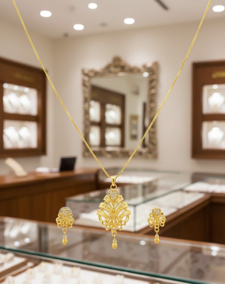 This sophisticated 1-Gram Gold Plated Set features a beautiful floral fan-like design. The pendant is topped with a tiny heart-shaped arrangement of shimmering stones, flowing down into intricate golden rays. Complete with matching drop earrings, this set offers a rich, authentic gold look that is perfect for any special occasion.