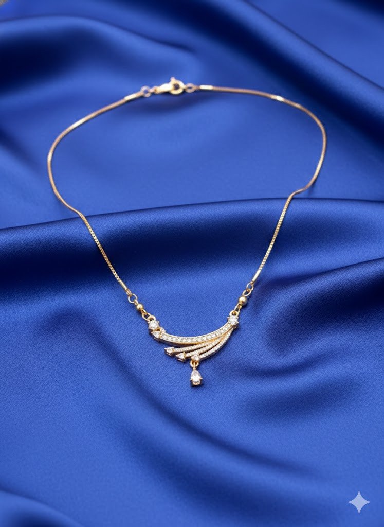Make a style statement with this contemporary Gold-Plated Wave Pendant Necklace. Unlike traditional designs, this piece features a unique asymmetrical "swoosh" design with three rows of sparkling American Diamonds. The artistic curves end with a shimmering teardrop stone, giving it a trendy and sophisticated look.