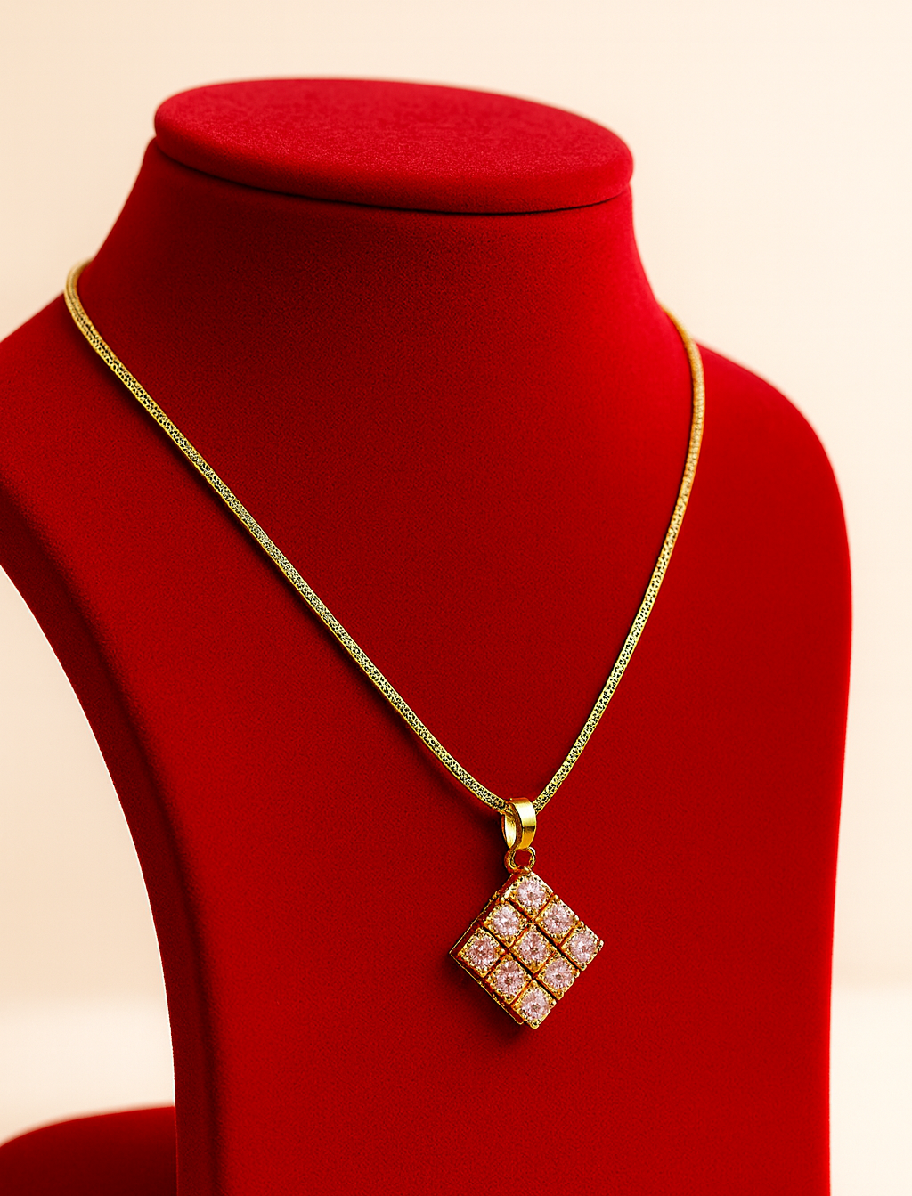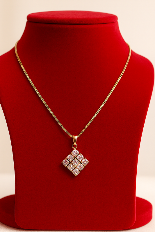 A symbol of refined elegance, this gold-plated necklace features a stunning square pendant crafted from radiant cubic zirconia stones. Each stone is precision-cut and arranged to create a brilliant cluster that captures and reflects light from every angle. Paired with a sleek, polished chain, this necklace adds timeless sophistication to any outfit.
