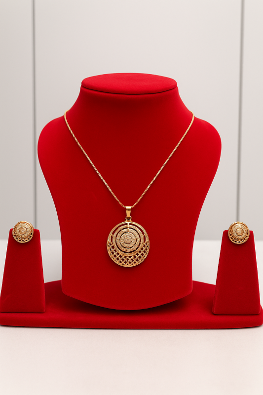 Add a touch of royal elegance to your look with this Designer Gold-Plated Pendant & Earrings Set, crafted with intricate circular artistry and encrusted with sparkling CZ stones. The stunning pendant showcases a layered concentric design paired with a beautifully detailed lattice pattern at the base—symbolizing grace, balance, and timeless charm.The matching earrings mirror the pendant's sophisticated design, completing the set with perfect harmony. Whether you're dressing up for festive celebrations, parties, weddings, or gifting someone special, this jewelry set adds a radiant sparkle to every moment.