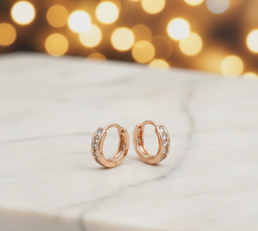 Experience the warmth and modern charm of these Rose Gold-Plated Huggie Hoops. Known for their soft, pinkish-gold hue, these earrings offer a unique and trendy alternative to traditional gold jewelry. The front is beautifully embedded with a vertical row of high-quality white stones that contrast perfectly against the rose gold finish.