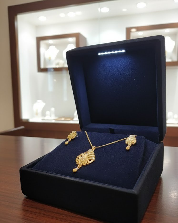 Complete Set: Includes a sleek gold-plated chain, a designer pendant, and matching earrings with droplets.