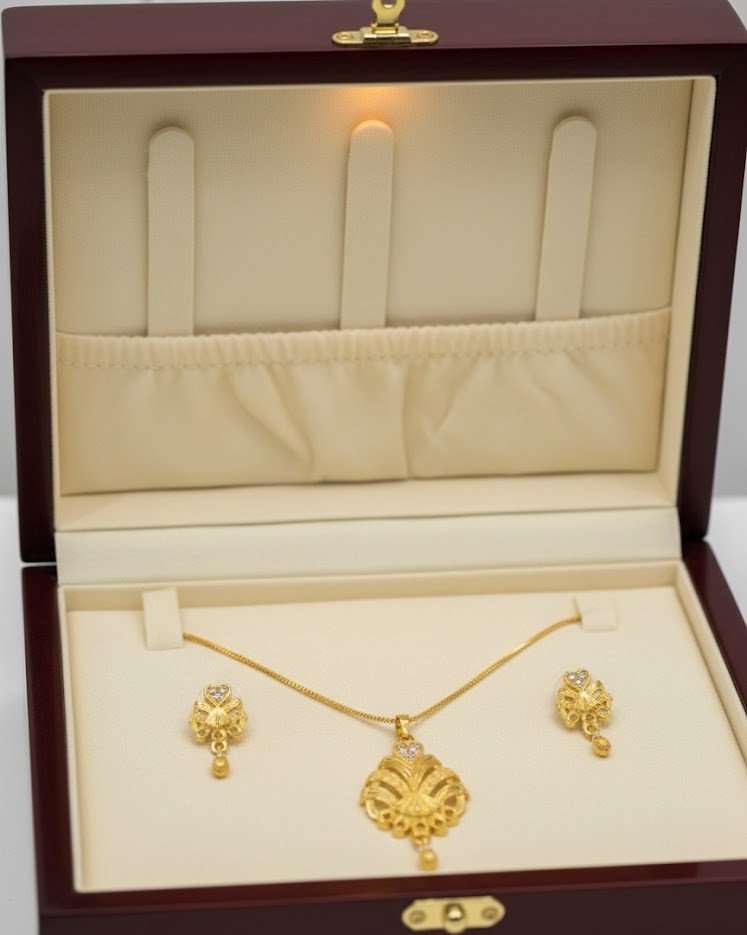 This sophisticated 1-Gram Gold Plated Set features a beautiful floral fan-like design. The pendant is topped with a tiny heart-shaped arrangement of shimmering stones, flowing down into intricate golden rays. Complete with matching drop earrings, this set offers a rich, authentic gold look that is perfect for any special occasion.