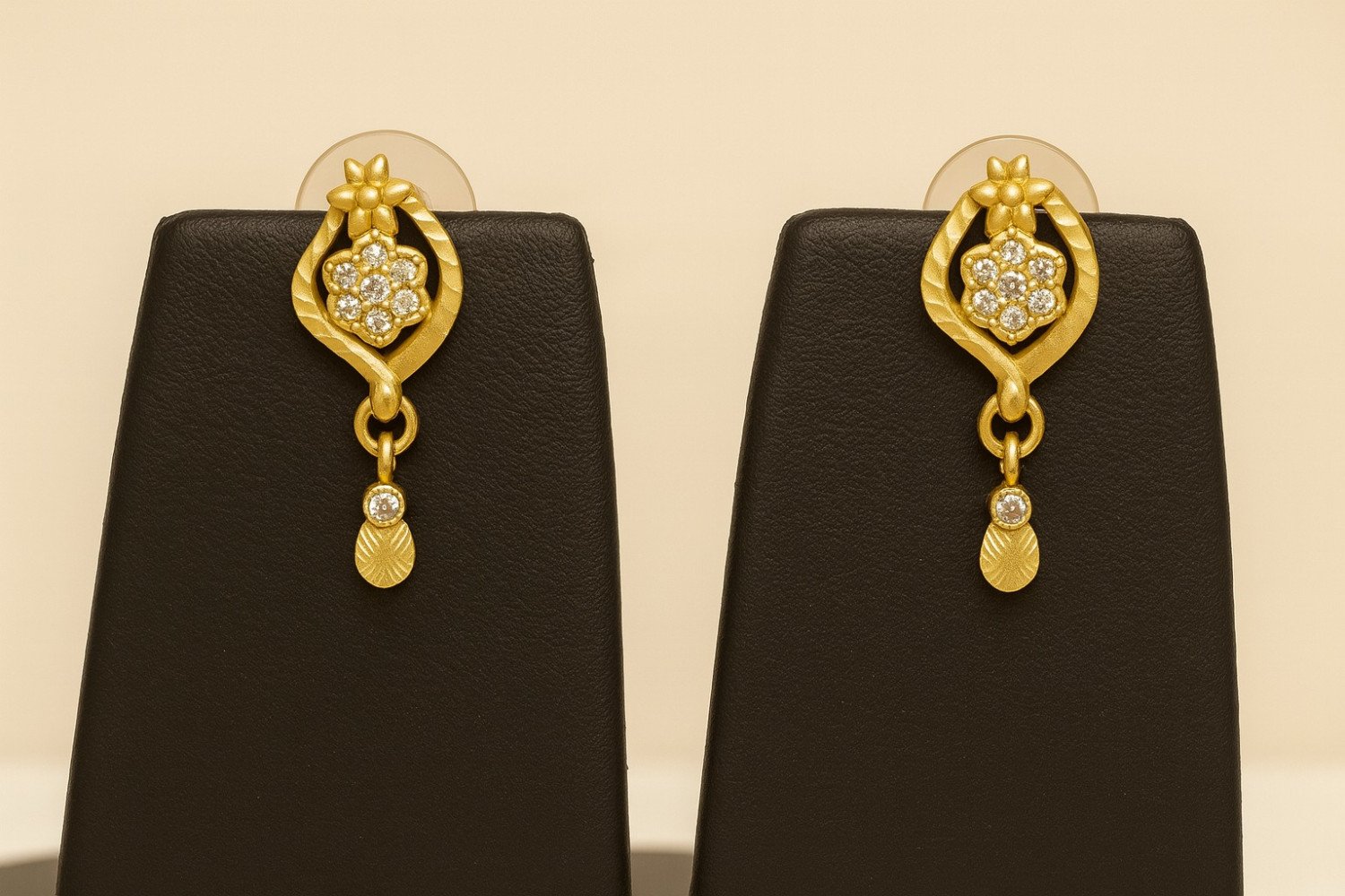 Floral cluster design with a matching gold droplet dangler.