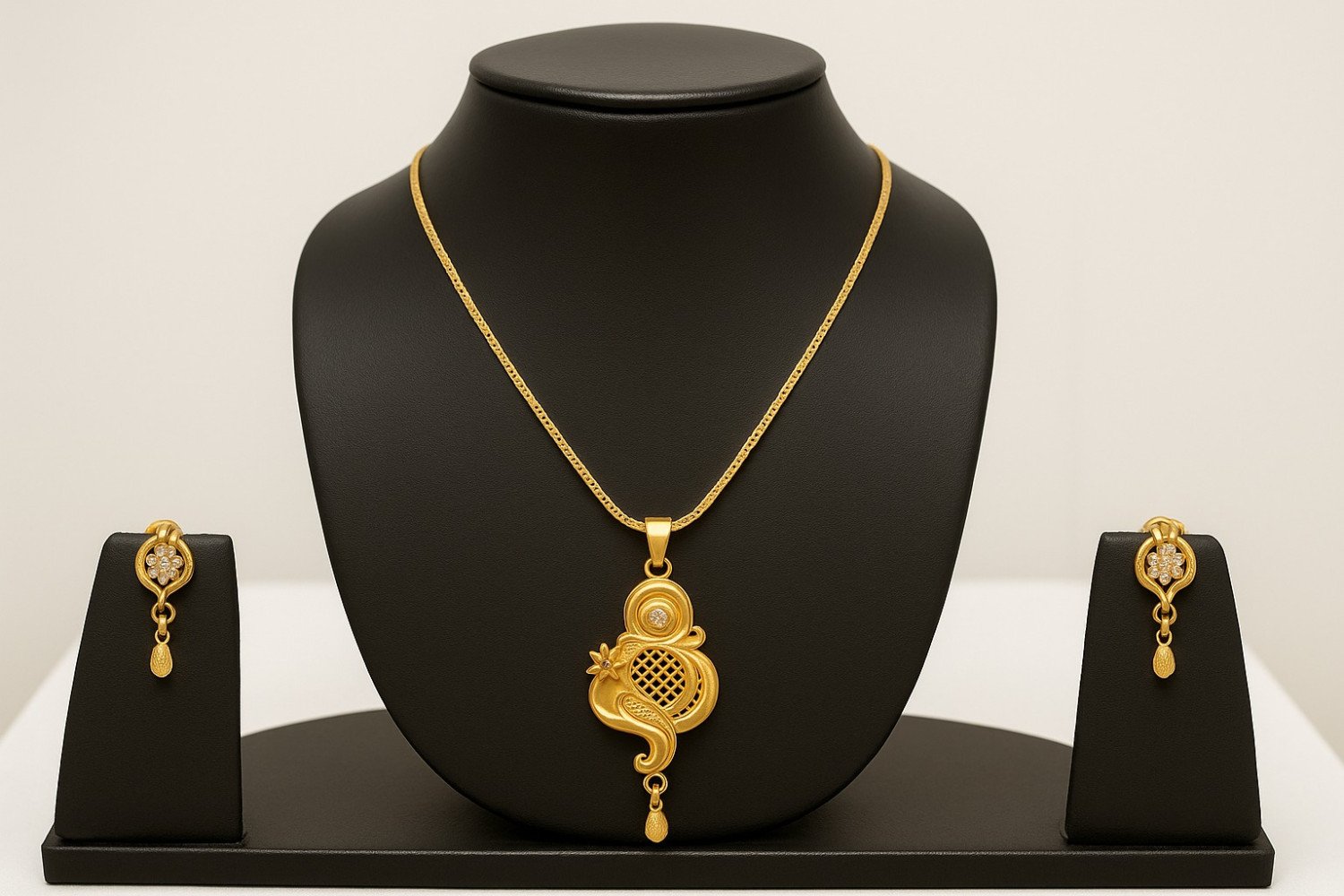 The matching earrings mirror the pendant's floral-inspired stone cluster and dangling drop, creating a balanced and luxurious look. Displayed on a bold black velvet stand, the craftsmanship and premium finishing of the jewelry truly shine, making this set ideal for festive occasions, weddings, parties, or gifting.