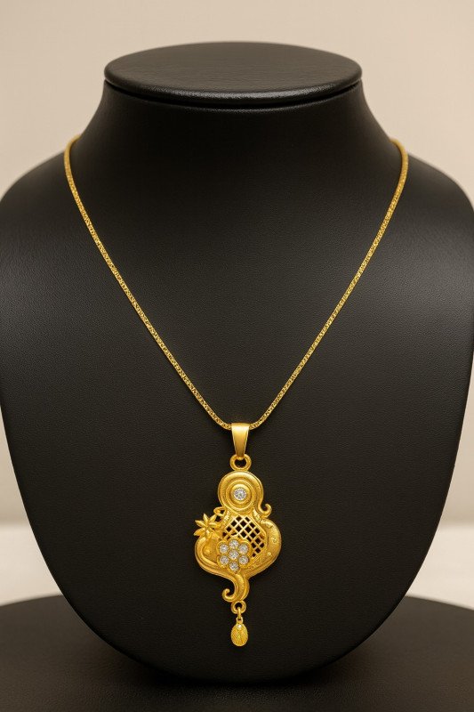 Introducing an exquisite Gold Plated Designer Necklace Set, crafted to reflect elegance, tradition, and modern artistry. The standout pendant showcases a unique sculpted shape, combining circular and swirl motifs with an intricate mesh centerpiece. A single shimmering stone is set gracefully at the top, adding brilliance and sophistication, while the delicate gold dangler enhances its charm.