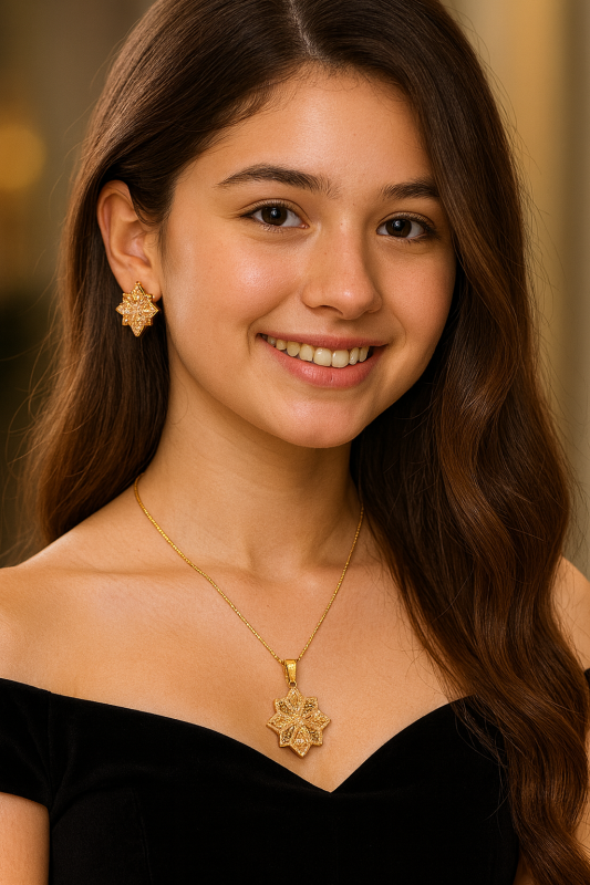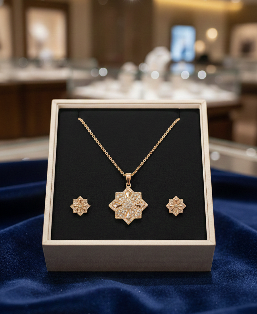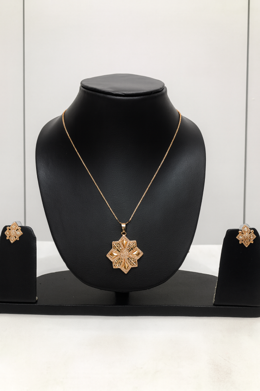 Elevate your elegance with this exquisitely crafted Gold-Plated Floral Star Necklace & Earring Set, designed to add a luxurious sparkle to every occasion. The centerpiece pendant features a beautiful star-shaped floral motif, embellished with shimmering stones that catch the light from every angle. Matching earrings complete the set, offering a perfectly coordinated and graceful look.