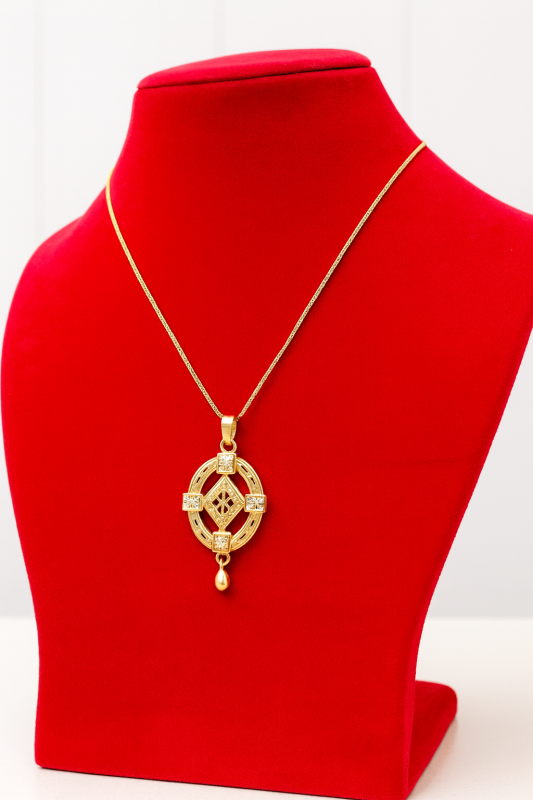 The earrings mirror the pendant's design perfectly, creating a balanced and graceful look. The teardrop dangler adds a touch of sophistication and gentle movement, making this set ideal for weddings, festive wear, parties, or gifting.