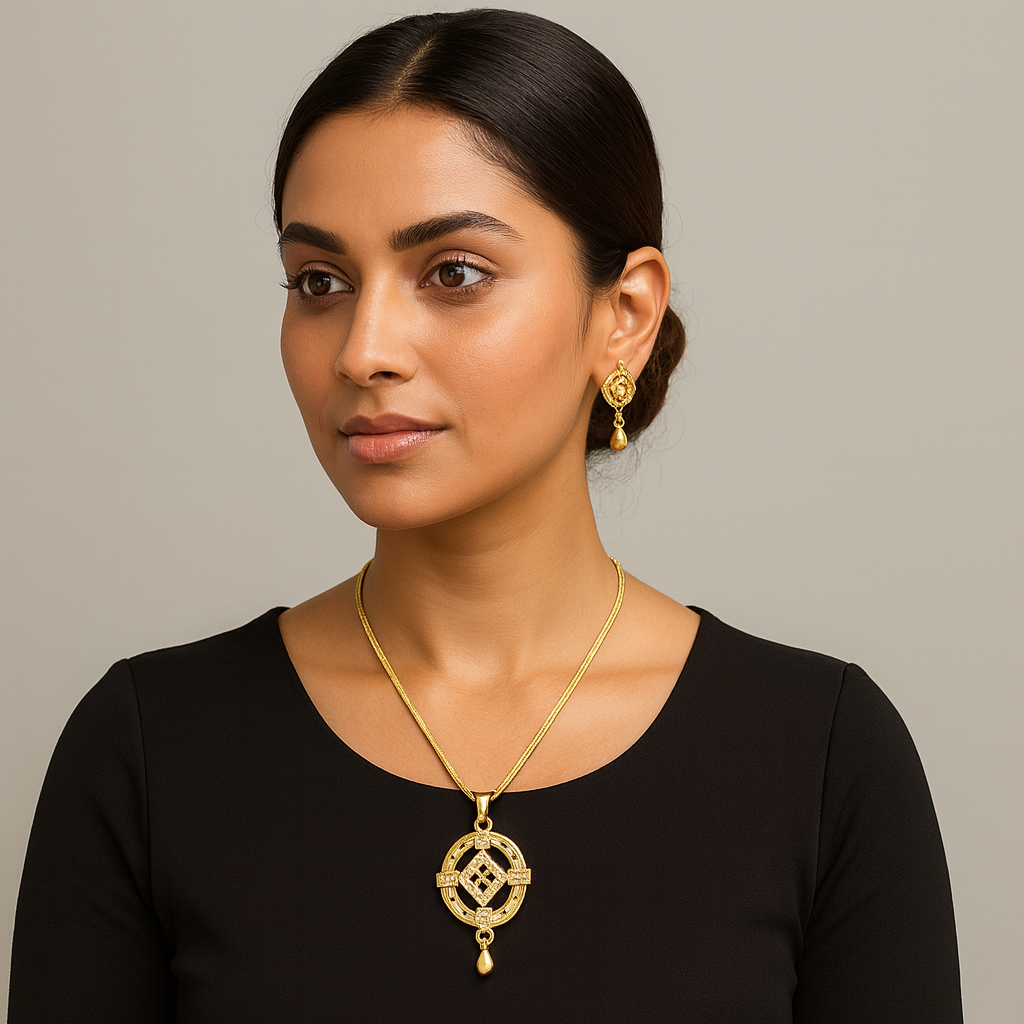 Presenting a timeless and intricately designed Gold Plated Necklace & Earring Set, crafted to elevate your elegance for any occasion. The centerpiece of this set is its stunning circular pendant featuring a geometric lattice pattern enhanced with sparkling cubic stones. The harmonious blend of traditional motifs and modern symmetry gives this jewelry set a distinctive royal charm.