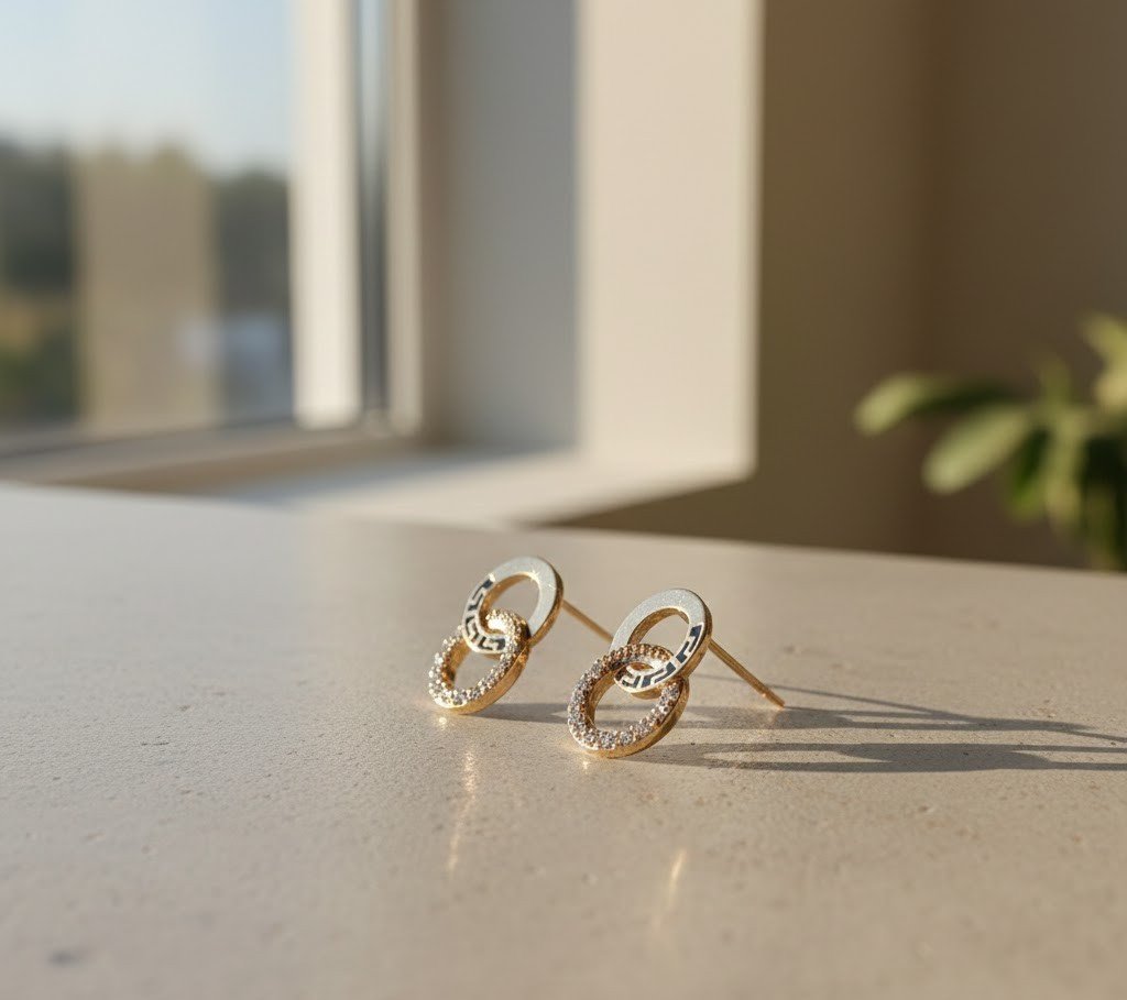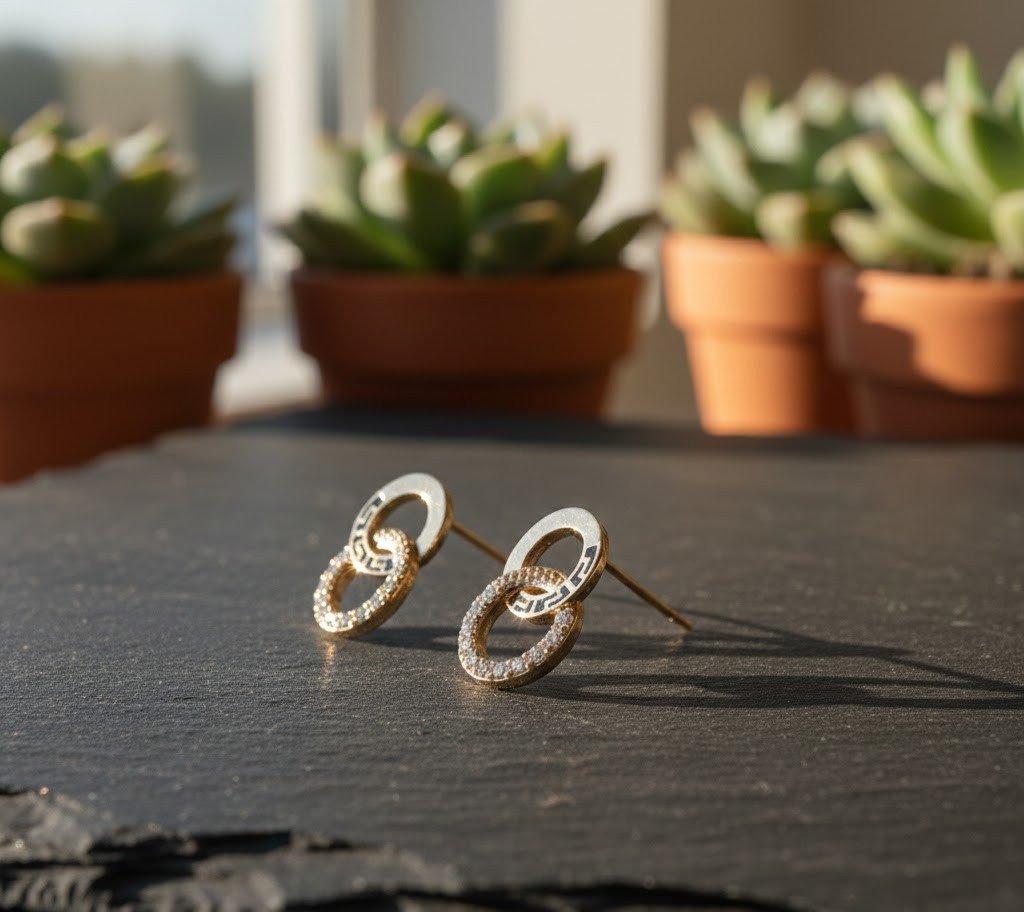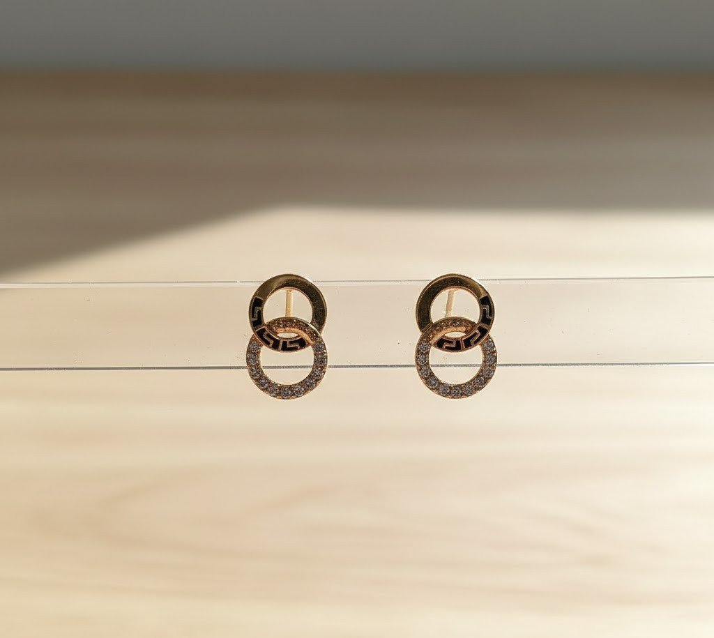These earrings are a masterclass in modern jewelry design. The "Double Loop" silhouette symbolizes infinity and connection, making them more than just an accessory. One loop features a textured Greek Key engraving, adding a vintage architectural feel, while the bottom loop is pavé-set with high-quality crystals that catch the light beautifully.