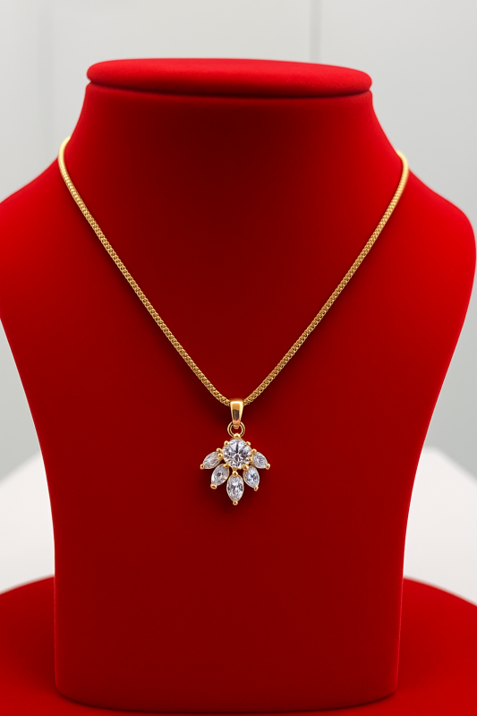 This stunning gold-plated necklace features a beautifully crafted floral-inspired pendant embellished with sparkling marquise-cut stones. The delicate chain paired with the radiant cluster design creates a timeless piece that adds effortless elegance to any outfit — from everyday wear to special occasions.