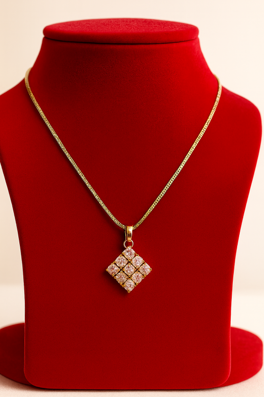 A symbol of refined elegance, this gold-plated necklace features a stunning square pendant crafted from radiant cubic zirconia stones. Each stone is precision-cut and arranged to create a brilliant cluster that captures and reflects light from every angle. Paired with a sleek, polished chain, this necklace adds timeless sophistication to any outfit.