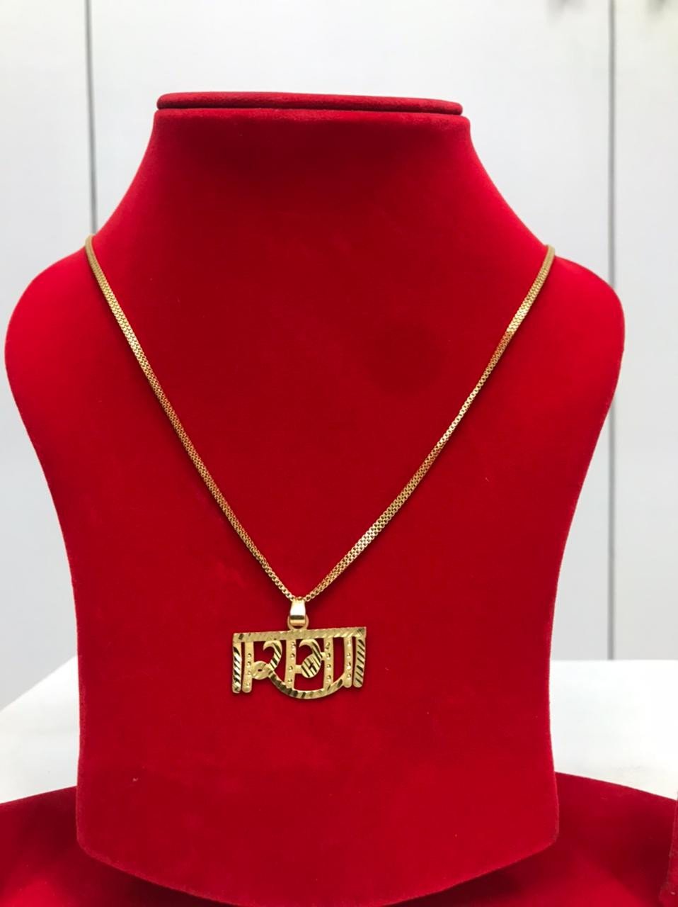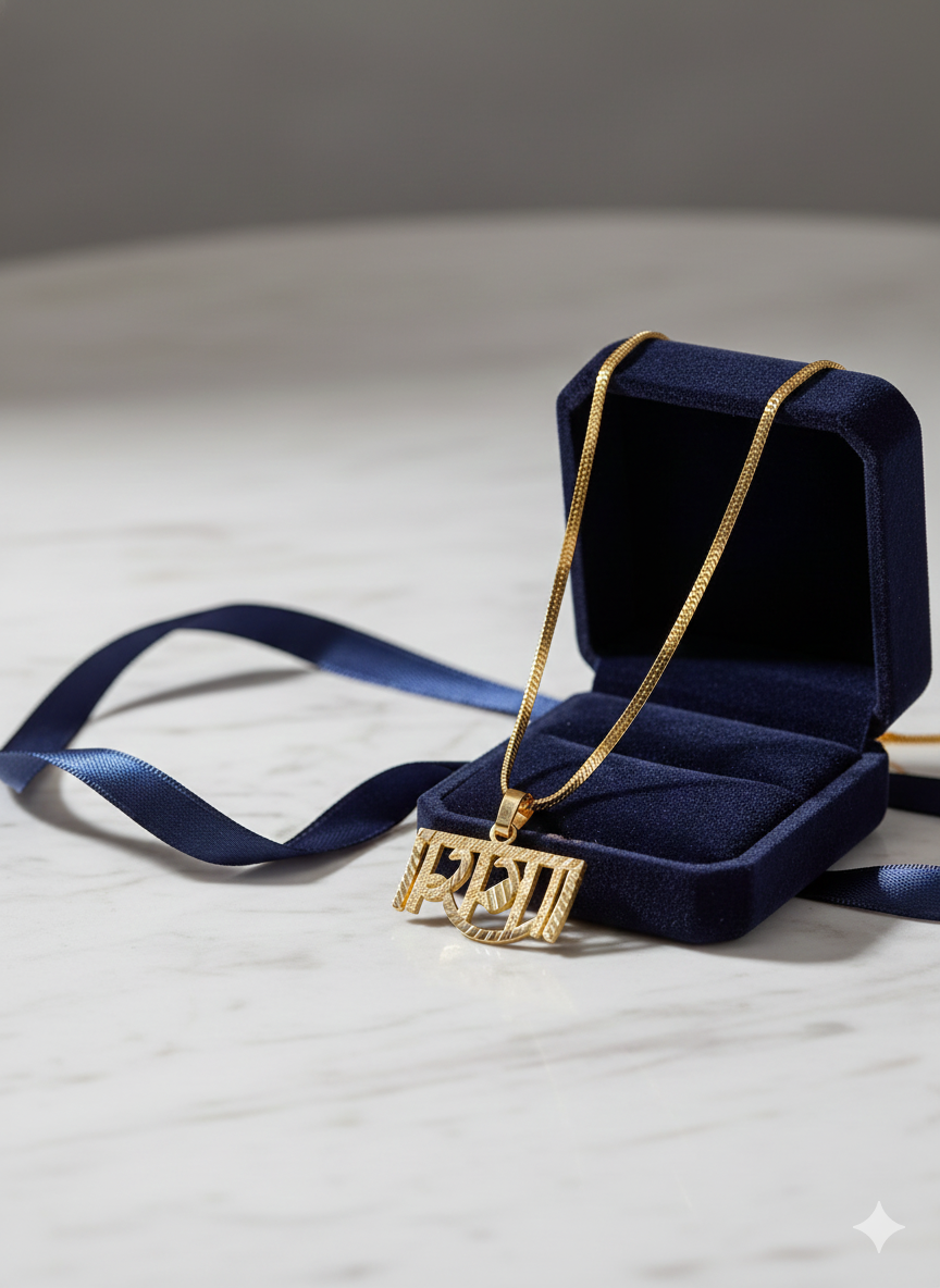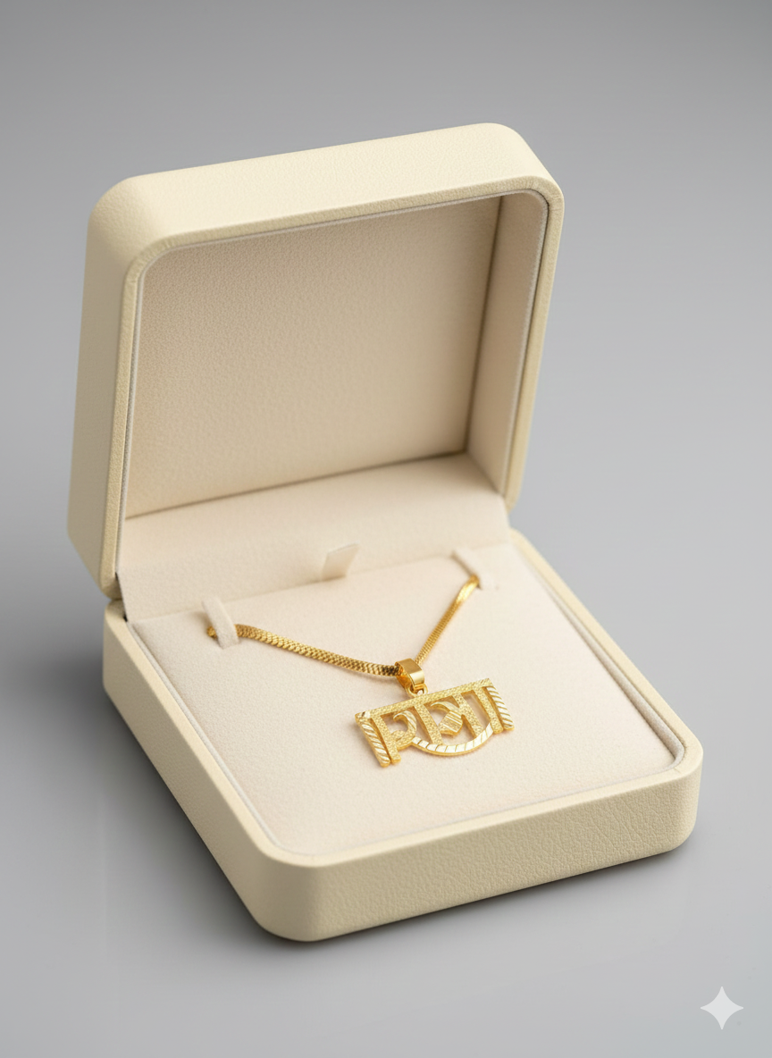 This collection of images showcases a stunning gold-colored pendant featuring the Hindi word "राम" (Rama),The script for "राम" is stylized with intricate patterns and textured details, giving it a unique and spiritually significant aesthetic. The rich red background of the display highlights the radiant golden hue and the detailed artistry of the pendant.